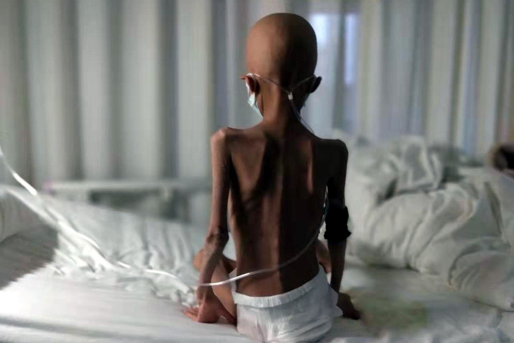 7岁的“排骨女孩”珍妮安静的坐在那里,让人不忍直视,化疗巨大的副作用让年幼的她生不如死,厌恶吐逆肚子痛的打滚,还得了胰腺炎,将近两个月没有吃东西的她全身简直只剩下骨头,哭闹着一刻也离不开妈妈。她说她都不记住肉是什么滋味了,饮鸩止渴的她有一次趴在妈妈的脖子狠狠咬了一口。妈妈吴何清强忍住眼泪,她说只需女儿好,哪怕拿自己的命换都可以…