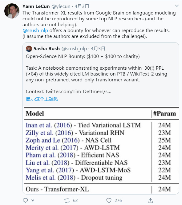 上周,图灵奖得主 Yann LeCun 公开质疑谷歌大脑的论文无法复现,引起了社区热议。Lecun 表示,即使是 NLP 的一些顶级研究人员也无法复现谷歌大脑的语言模型 Transformer-XL 所得到的结果。此外,有人还面向广大研发人员发出了「江湖悬赏令」,称成功复现者将获得「酬劳」。
