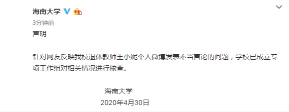 原标题:海南大学:针对网友反映我校退休教师王小妮宣布不妥言辞问题,校园已建立专项工作组核对