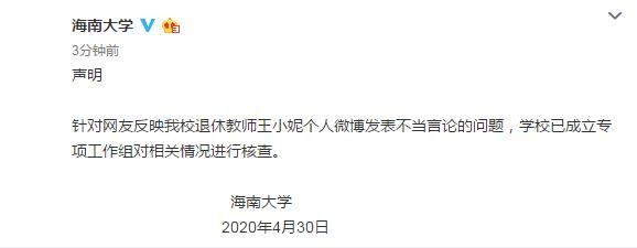 4月30日,@海南大学 宣布声明,称针对网友反映该校退休教师王小妮个人微博宣布不妥言辞的问题,校园已建立专项工作组对相关状况做核对。