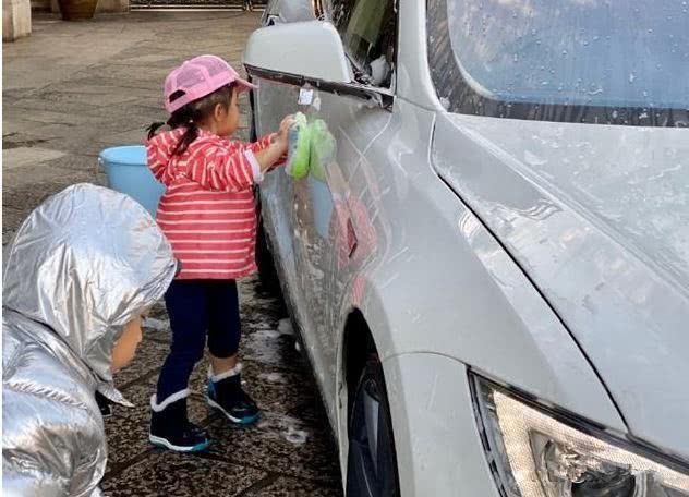 从图片傍边咱们咱们能够看到,小女儿现已将车子的一侧擦洗得十分洁净了,但她却仍是没有停下来的意思,持续仔细的擦车。能够看得出来,小女儿虽然身高不够高,可是她对洗车的使命十分重视。一起霍启刚的儿子也在车的别的一旁擦洗着车子的外部。一儿一女一起洗车的相片也引发了网友们的热议。