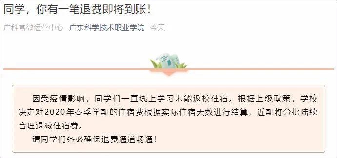 因受疫情影响,同学们一向线上学习未能返校住宿。依据上级方针,校园决议对2020年春季学期的住宿费依据实践住宿天数进行结算,近期将分批连续合理退减住宿费。请同学们必须保证退费通道疏通!