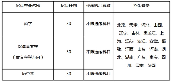 注:汉语言文学(古文字学方向)、历史学在非高考变革省份仅接收文科生,哲学文理兼招;各招生省份详细投进的招生专业以报名体系内信息为准。