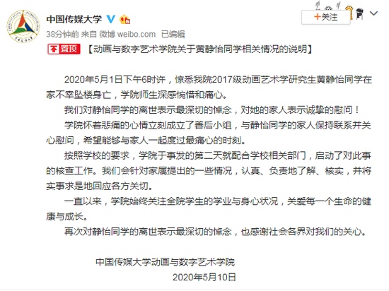 2020年5月1日下午6时许,惊悉我院2017级动画艺术学研讨生黄静怡同学在家不幸坠楼身亡,学院师生深感怅惘和痛心。