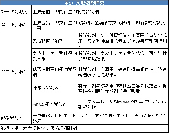在曩昔的一百年间,光敏剂已进行了屡次迭代晋级(见表1)。第一代光敏剂首要是血卟啉的衍生物(HpD)的混合制剂,尽管在临床上现已取得明显的作用,但存在安排挑选性差、医治深度不行、体内代谢缓慢等缺陷。第二代光敏剂最重要的包含卟啉类衍生物、金属酞菁类以及稠环醌类光敏剂三类,极大进步了光动力医治的作用。