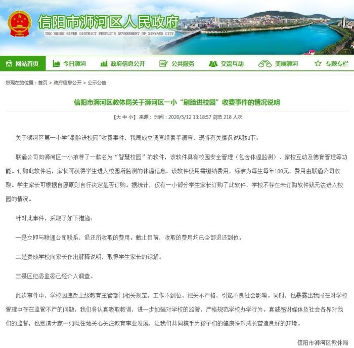 针对河南省信阳市浉河区一小学“刷脸进校园”收费事情,信阳市浉河区教体局今天经过信阳市浉河区人民政府网站作出状况阐明。阐明指出,收取的费用均已悉数交还到位,区纪委监委已介入查询。