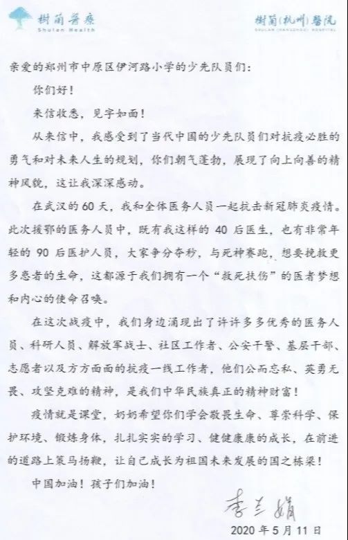 “伊河路小学的少先队员们,你们好,来信收悉,见字如面……”新学期伊始,中原区伊河路小学的少先队员们收到一件令他们惊喜而振作的特别来信——一封李兰娟院士写给校园整体少先队员们的回信!