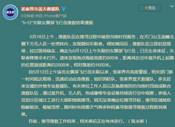 通过现场核实,确以为5月12日上午失联的翼装飞翔女大学生,搜救人员赶到现场后,她现已无生命体征,