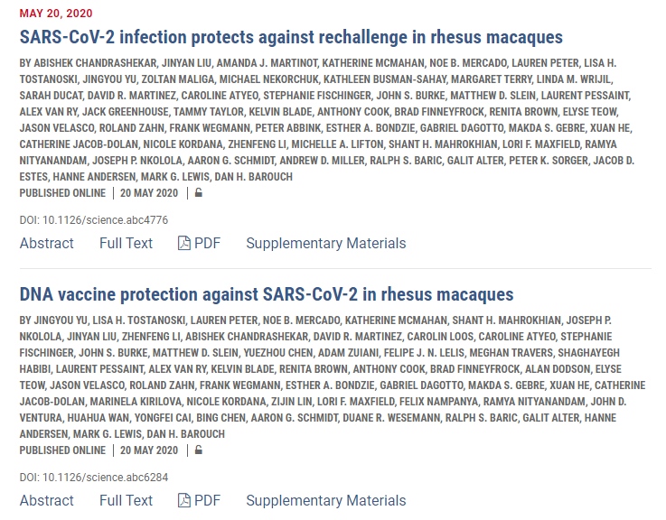 [2] Abishek Chandrashekar et al., (2020), SARS-CoV-2 infection protects against rechallenge in rhesus macaques, Science, DOI: 10.1126/science.abc4776