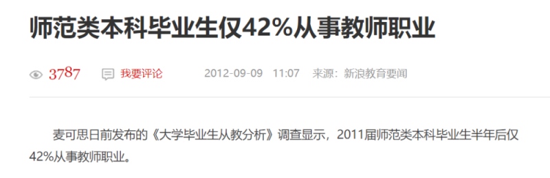 早在2011年的《大学毕业生从教剖析》查询就现已显现,2011届师范类本科毕业生半年后仅42%从事教师作业,其时还未引起世人的留意。