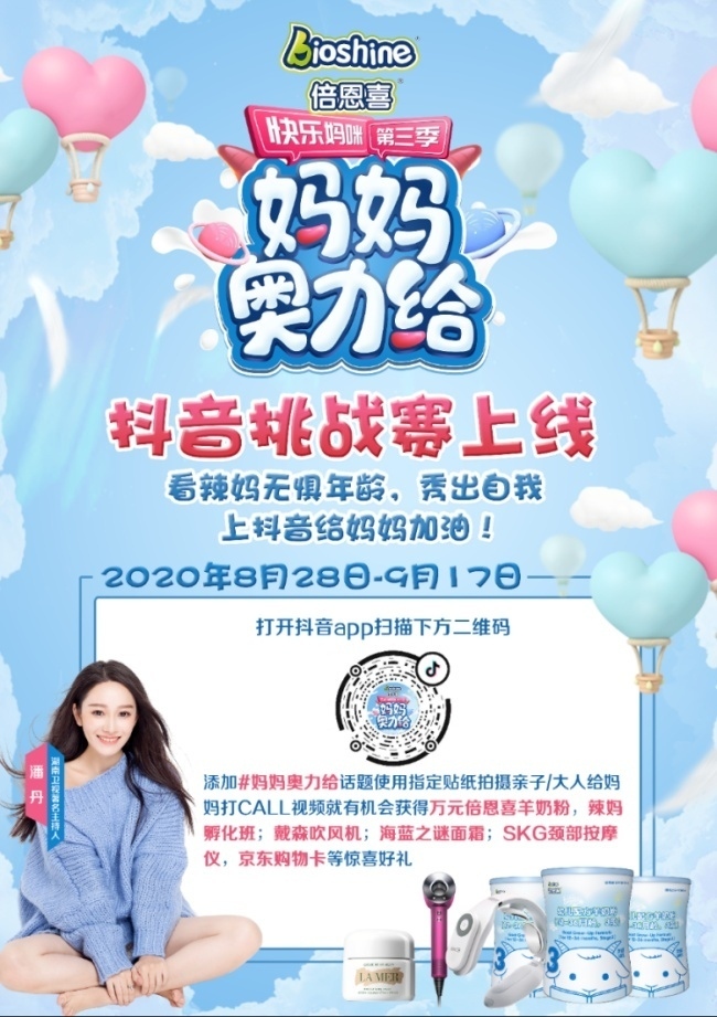 为寻找倍恩喜品牌城市公益大使,为城市代言为家乡打call,2020年8月28日至2020年9月17日,倍恩喜邀请广大用户参与“妈妈奥力给”抖音挑战赛,参赛者可以通过抖音码扫码和搜索话题“妈妈奥力给”等两种方式参与活动,在视频中需要妈妈和萌宝共同出镜并使用“妈妈奥力给”贴纸,拍摄原创且积极乐观,符合妈妈奥力给主题的视频,添加定制话题#妈妈奥力给#发布并上传视频@倍恩喜Bioshine,即报名成功。倍恩喜将根据作品点赞数、互动量、视频创意,综合考量进行排名,趣味多多,奖品多多!