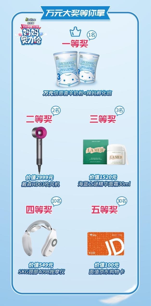 本次挑战赛,倍恩喜为广大粉丝准备了丰厚的福利,获得一等奖的粉丝不仅可以拥有万元倍恩喜羊奶粉,还可以前往长沙参加倍恩喜辣妈孵化班,学习形体、穿搭、礼仪、育儿等丰富辣妈课程,成为倍恩喜辣妈天团,成为倍恩喜形象大使授权。