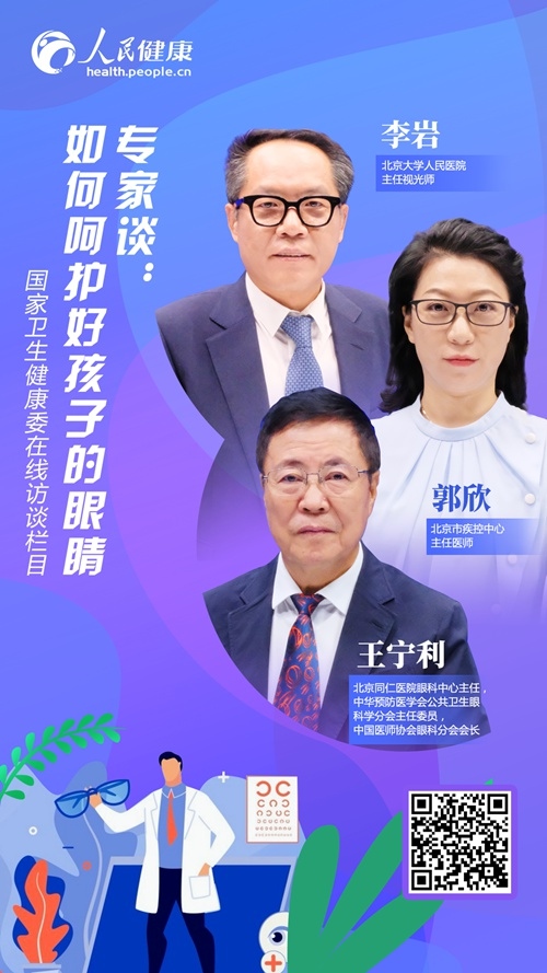 对此,人民网联合国家卫生健康委,邀请北京同仁医院眼科中心主任、中华预防医学会公共卫生眼科学分会主任委员、中国医师协会眼科分会会长王宁利,北京市疾控中心主任医师郭欣,北京大学人民医院主任视光师李岩,为大家普及近视防控的科普知识,指导家庭和儿童青少年做好近视防控。