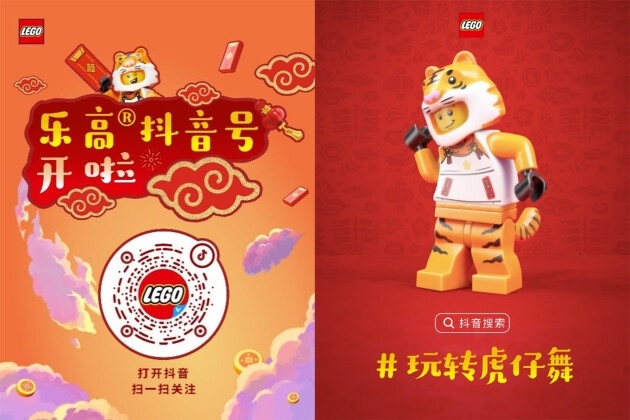 2022年1月,乐高®玩具正式登陆抖音平台,开通官方品牌账号(账号名:@LEGO乐高),为抖音平台上的乐高粉丝们带来缤纷有趣的产品及玩乐体验的短视频内容。此外,还在抖音平台发起了#玩转虎仔舞挑战赛,号召粉丝们与乐高®虎仔合拍玩转虎仔舞,赢取乐高®套装等惊喜新年礼。该活动一经推出就获得网友们的踊跃参与,和小虎仔一同玩转舞步,玩转虎年新节奏。
