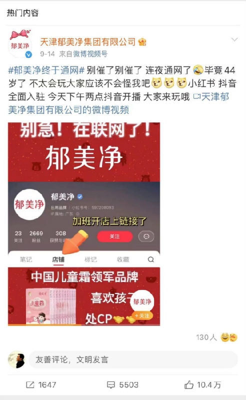 9月下旬,郁美净猝不及防火出圈。“郁美净连夜通网”“郁美净董事长直播间跳舞”等词条连续登顶热搜,不到3天,这家老国货品牌就涨粉超百万,在多个电商平台遭疯抢,十几个“爆款”卖脱销。